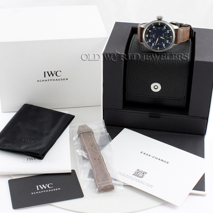 IWC Titanium Big Pilot Ref IW329701, the warranty card indicates it was purchased new on 9/2023. 43mm Titanium case with fixed bezel, screw down IWC crown, and sapphire crystal. Black matte dial with white Arabic numerals, luminous hands and markers, 12 hour numerals on the center of dial. Automatic 25J, caliber 79320 is running and functioning properly. Presented on a brown strap with steel IWC deployant buckle. This preowned watch comes with IWC box, warranty card, extra IWC strap with easx-change system instruction manual, and cleaning cloth, as shown.
