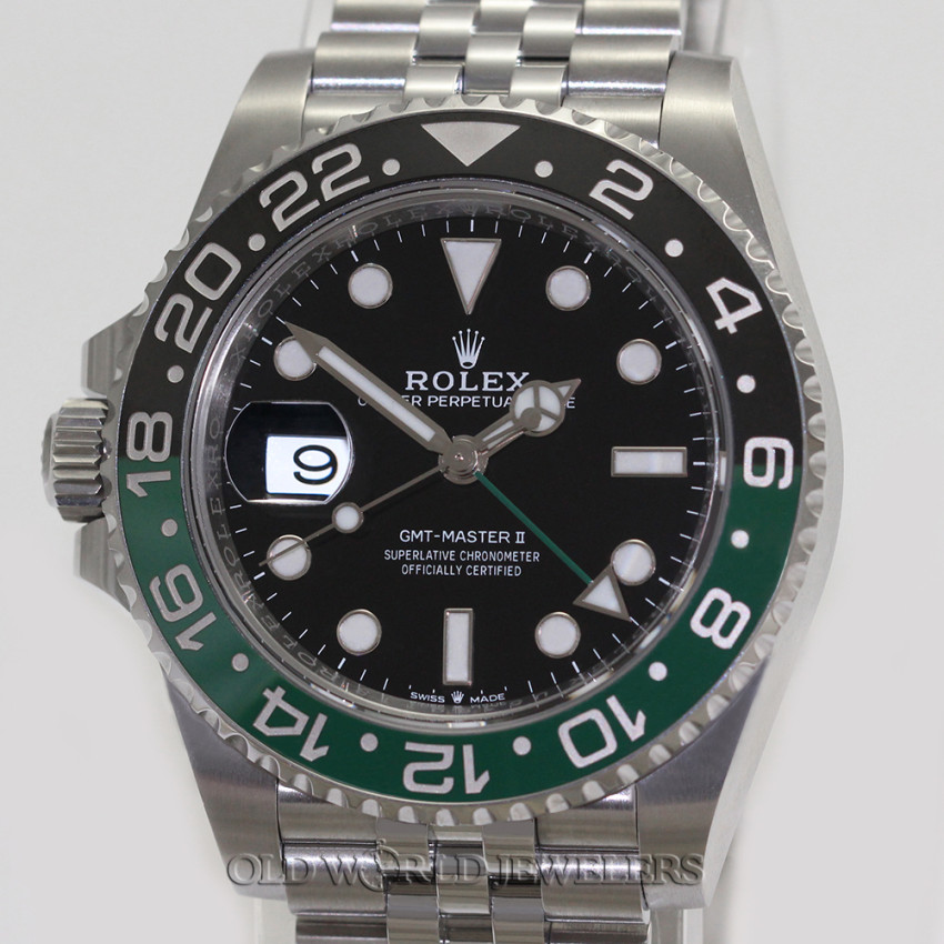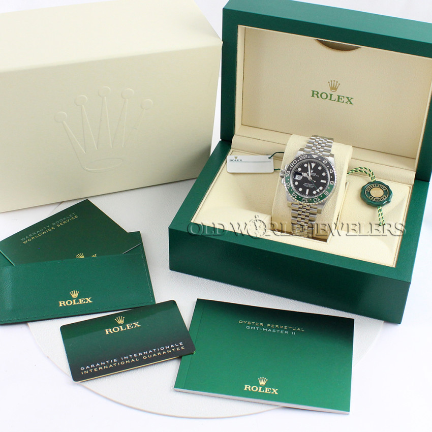 Rolex Stainless Steel GMT Master II "Sprite" Ref 126720VTNR, warranty card indicates this was purchased new on 06/2024. 40mm Stainless steel case with special black and green ceramic bezel insert, and screw down Rolex crown on the left. Black dial with luminous hands and markers, independently adjustable 12 hour hand, and date at 3. Automatic Caliber 3285 chronometer movement is running and functioning properly. Stainless steel Rolex Jubilee bracelet fastens with a fold-over clasp and will fit a 7-1/2" wrist with the extension link extended. This preowned watch comes with Rolex box, instruction books, warranty card, and original hang tags.