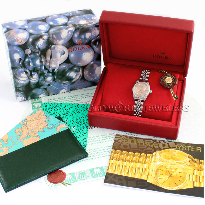 Rolex Stainless Steel Lady Date Ref 69240, "U" serial number, papers indicate this was purchased new 11/1998. 26mm stainless steel case with engine turned bezel, screw down Rolex crown and sapphire crystal. Pink dial with Arabic numerals and luminous markers, sweep seconds hand and date at 3. Automatic movement is running and functioning properly. Stainless steel Rolex Jubilee bracelet with fold-over clasp will fit a 7" wrist. The case shows wear consistent with age. This preowned watch comes with Rolex box, papers, instruction booklet, and hang tag, as shown.