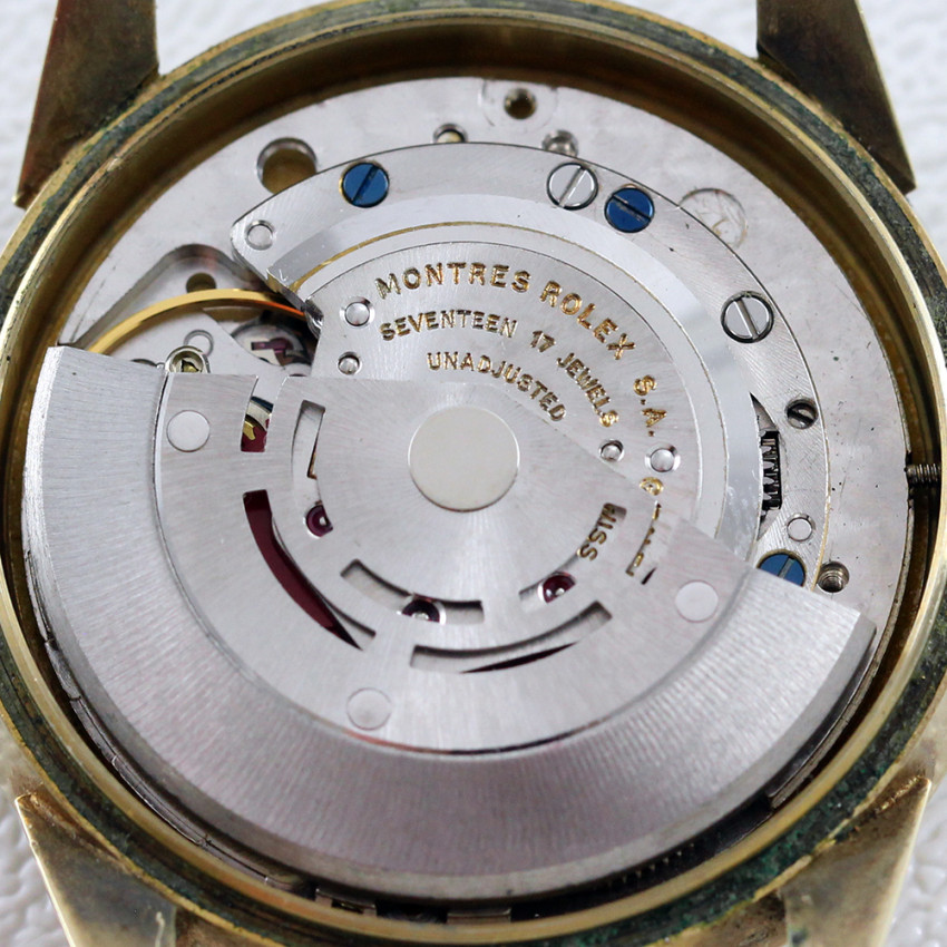 Rolex Vintage Presentation Service Wrist Watch Ref 7002, circa 1964. 35mm, 14K Gold Filled case with fixed bezel, angled lugs, and snap on case back. The case back is engraved - "25 Years Service, St. Regis Paper Company, Frank P. Borowy, 1964". Cream colored dial with sweep seconds hand. 18K Gold Electroplated bracelet secures with a fold-over clasp and will fit a 7-1/2" wrist. Automatic movement is running and functioning properly. The inside case back is stamped "Rolex 14KG.Filled 13451". The movement is marked "Montres Rolex S.A., Geneva Swiss 17 Jewels, 1520". This preowned watch has wear consistent with age.