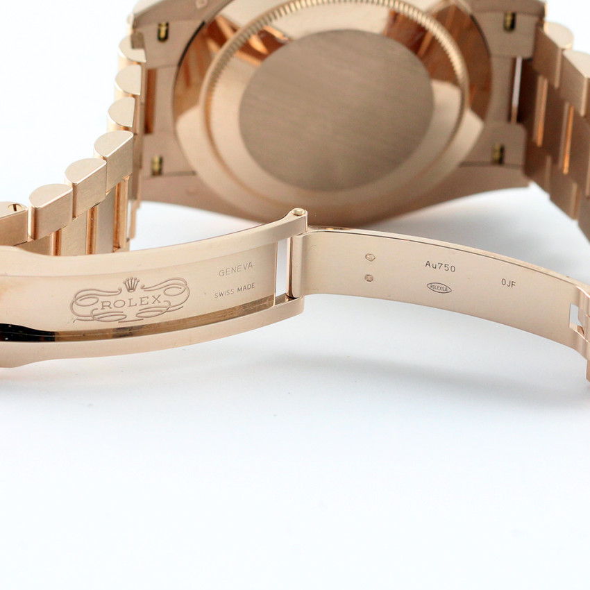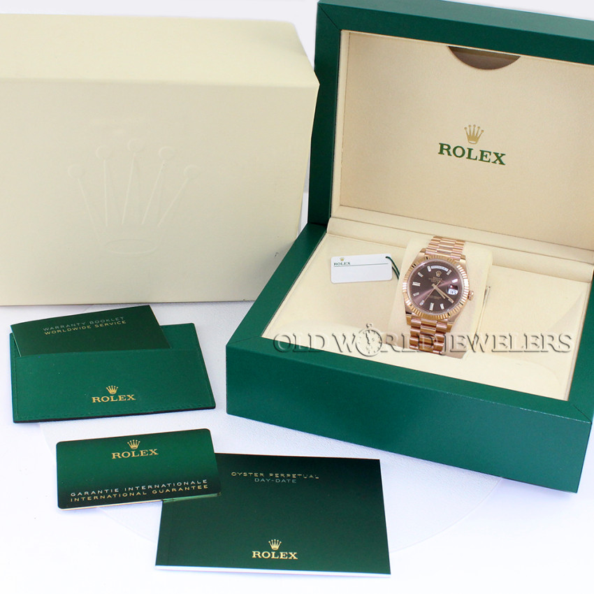 Rolex 18K Everose Gold Day-Date 40 President, Reference 228238, warranty card indicates this was purchased new 12/2025. 40mm 18K Rose gold case with 18K fluted bezel, screw down Rolex crown, and sapphire crystal. Factory Chocolate dial with Baguette diamond markers, rose gold hands, sweep seconds hand, day at 12, date at 3. Automatic 31 Jewel, Caliber 3255 chronometer movement is running and functioning properly. 18K Rose Gold President's bracelet with hidden clasp will fit a 7-1/4" wrist. This preowned watch comes with Rolex box, warranty card, and white hang tag with correct dial code.