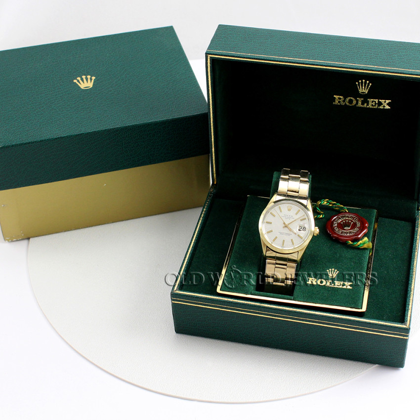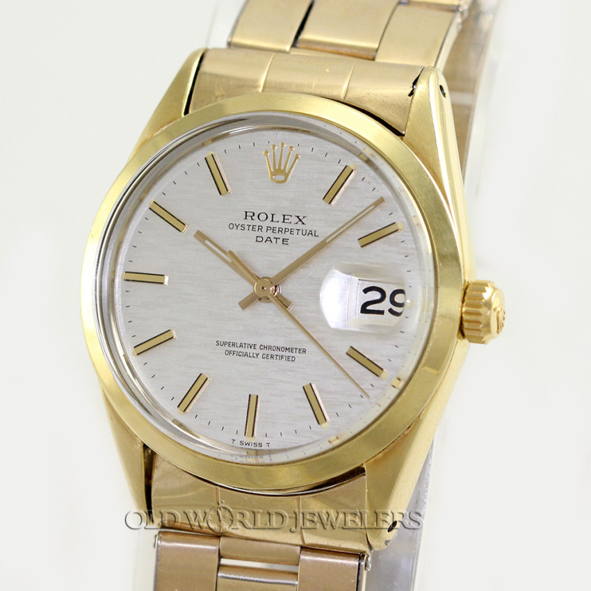 Rolex Vintage Oyster Perpetual Date Ref 1550, serial number 3249XXX dates production to 1973. 34mm 14K gold plated over steel case with a domed bezel, stainless steel case back, screw down Rolex crown, and acrylic crystal. Silver Mosaic dial with applied stick markers, sweep seconds hand, and date at 3. There is a discoloration around the date wheel, which is shown in the picture. Automatic 26 Jewel, Caliber 1570 movement is running and functioning properly. Electroplated Oyster bracelet with Rolex fold-over clasp will fit a 7-1/2" wrist. The case and bracelet shows some wear through consistent with age. This preowned watch comes with a Rolex box only. A nice example of a Vintage Date.