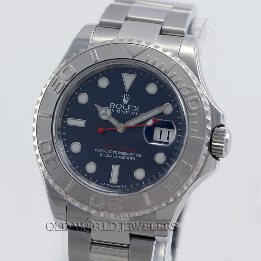 Rolex Stainless Steel Yacht Master 40, Reference 116622, circa 2013. Full size 40mm stainless steel case with Rolex screw-down crown, platinum rotating bezel, and sapphire crystal. Factory blue dial with Red seconds hand, luminous hands and markers, and date at 3 o'clock. Stainless steel Rolex Oyster bracelet with new style flip-lock clasp will fit a 7-1/4" wrist. 31J automatic movement is running and functioning properly. This preowned watch comes with Rolex box, warranty card dated April 2013, hang tag, and instruction booklet, as shown.