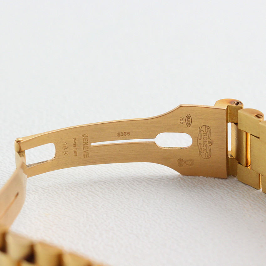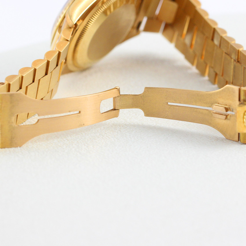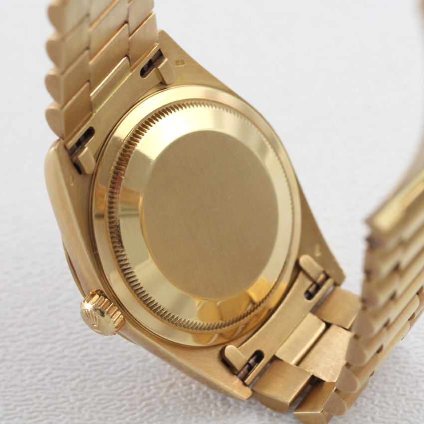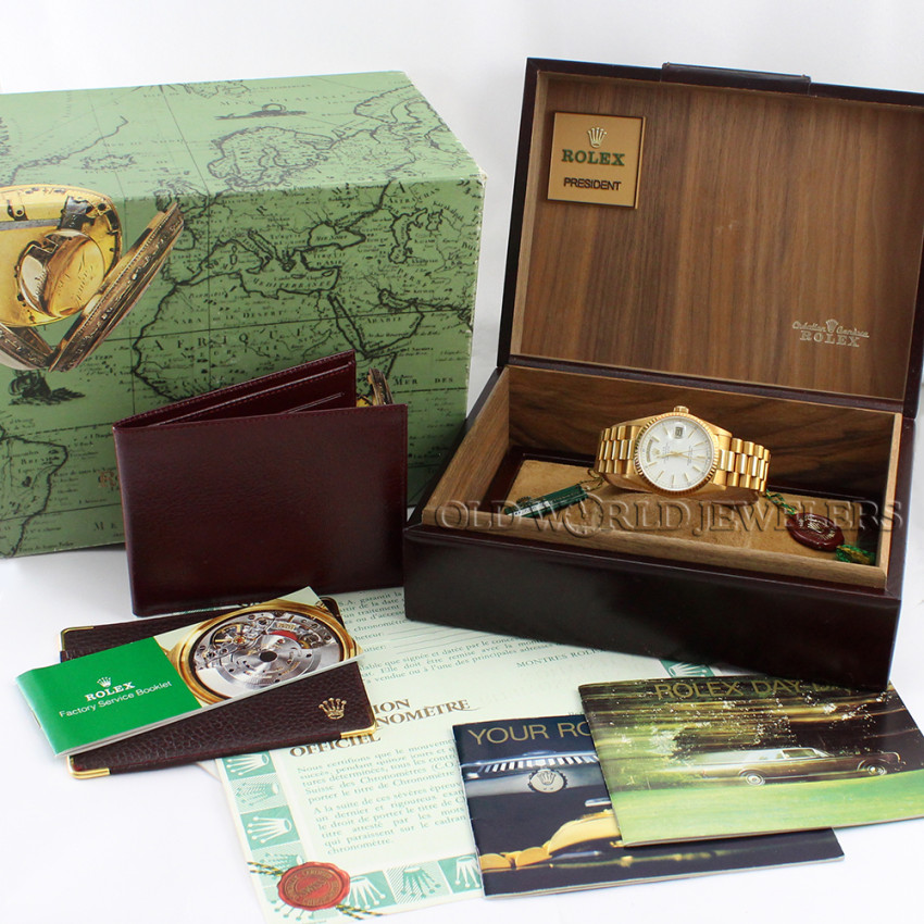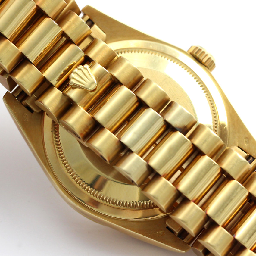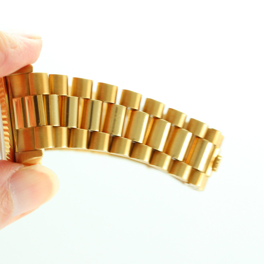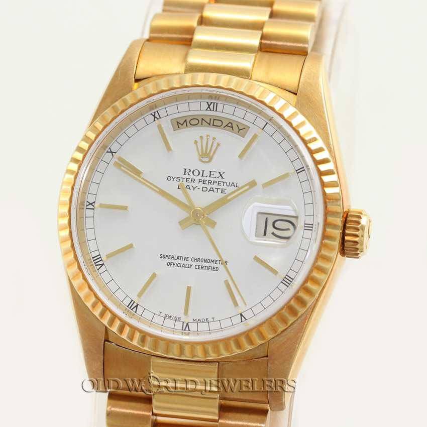 Rolex Men's 18K Yellow Gold President Day Date Reference 18238, "L" serial number dates production to 1989. 36mm 18K yellow gold case features fluted bezel, sapphire crystal, and screw down Rolex crown. White porcelain dial with stick markers, sweep seconds hand, and date at 3. The18K Yellow Gold President bracelet secures with a hidden clasp and will fit a 7-1/4" wrist. It is in very good condition, but has one ding in a center link as shown in bracelet picture. This watch has an overall patina making the case appear rose gold - We chose not to polish it. Automatic movement is running and functioning properly. This preowned watch comes with original Rolex box, papers, instruction booklets, wallet, and hang tags.
