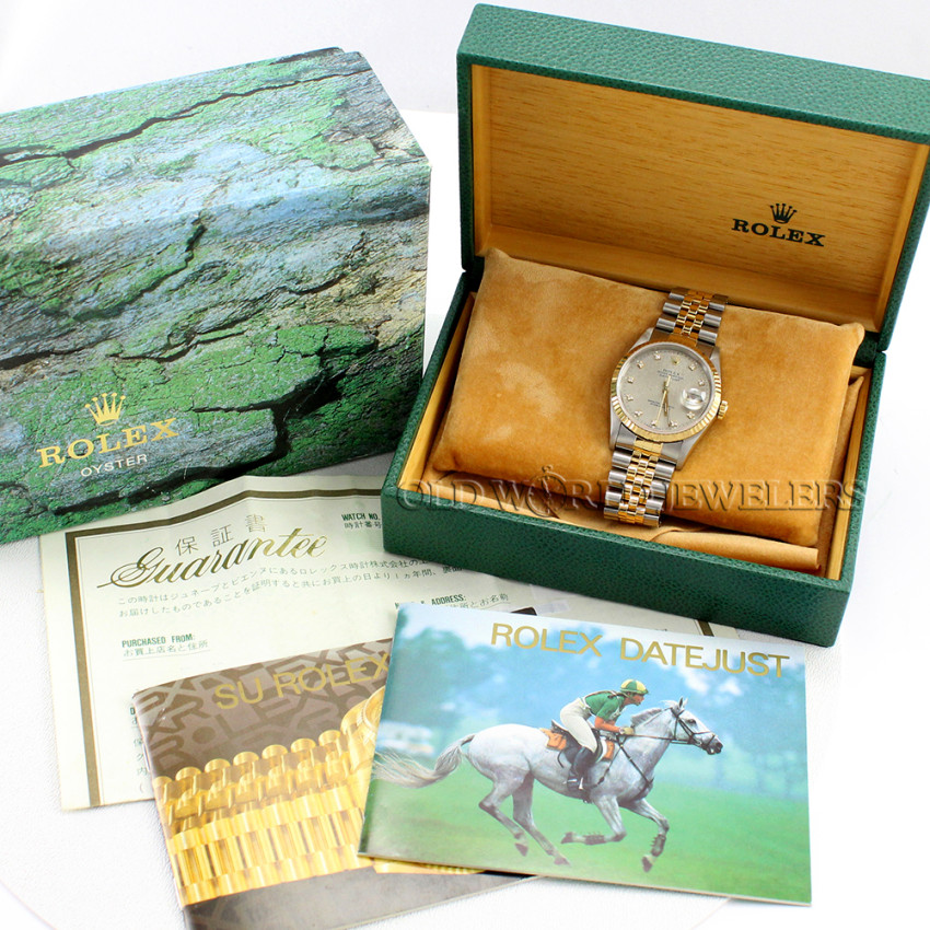Rolex Steel and 18K Yellow Gold Datejust Ref 16233, W346XXX Serial number dates production to 1995, the papers indicate it was purchased new January 1996 in Japan. 36mm stainless steel case with 18K yellow gold fluted bezel, screw down Rolex crown and sapphire crystal. Rolex factory silver Anniversary "computer" dial with diamond markers, sweep seconds hand and date at 3. Automatic movement is running and functioning properly. Stainless steel and 18K yellow gold Rolex Jubilee bracelet fastens with a stainless steel fold-over clasp and will fit a 7" wrist. This preowned watch comes with Rolex box, papers from Japan, and instruction booklets.