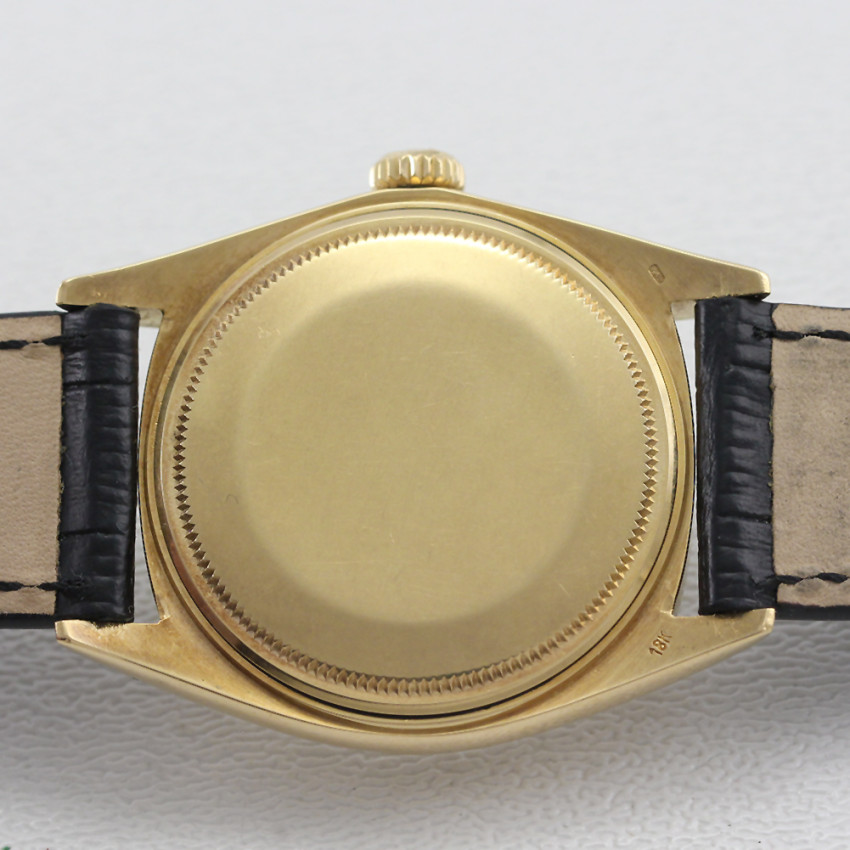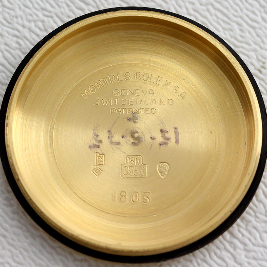 Vintage Rolex Day Date President Reference 1803, 2394XXX serial number dates production to 1968. 36mm 18K Yellow Gold case with fluted bezel, screw back case, and screw in Rolex crown. The crown has wear consistent with age. Champagne dial with "Wide Boy dial and hands", day window at 12, and date at 3. Automatic 1556 movement is running and functioning properly. Presented on a black replacement strap and gold colored buckle. The inside case back is stamped "Montres Rolex S.A. Geneva Switzerland, 18K 1803". The movement is marked "Montres Rolex S.A. Geneva Swiss 26 Jewels, DD626397, 1556". This preowned watch is a nice example of a Vintage President.
